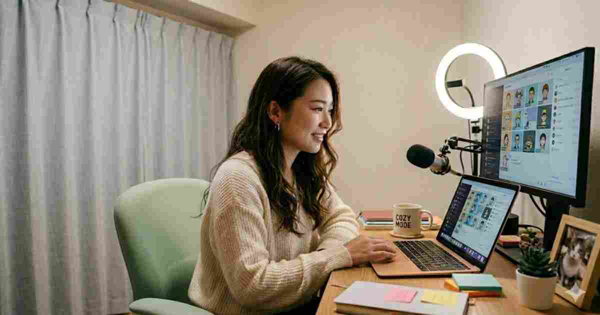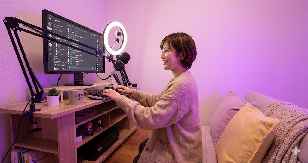 通勤ルームは防音対策がしっかりと施されており、背景も生活感のないシンプルな壁や可愛らしいインテリアに統一されています。